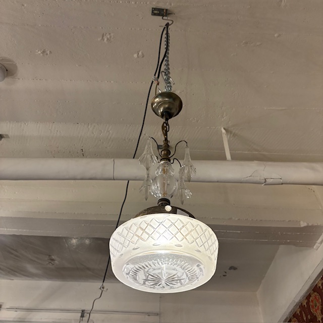 Elegante antike Hängelampe mit geschliffenem Kristallglas und dekorativen Messingdetails.