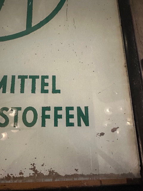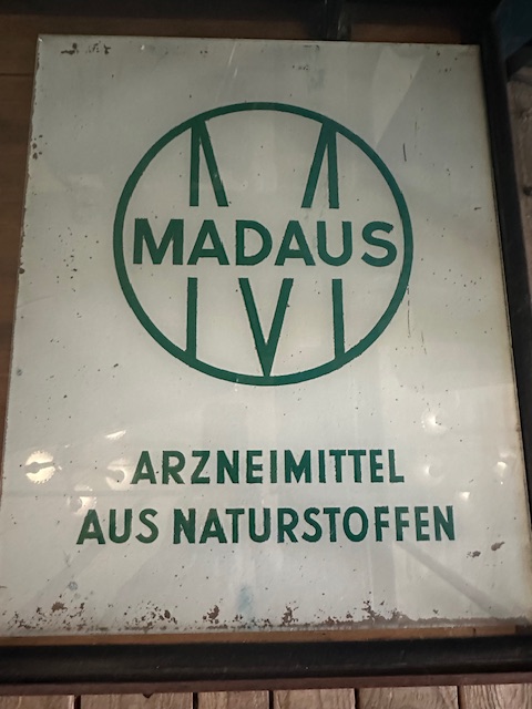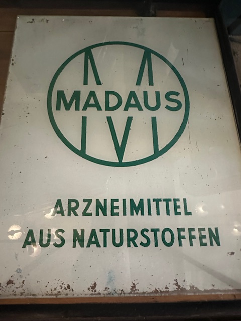 Schönes Glaswerbeschild MADAUS, aus den 1950-1960er Jahren, handbemalt.