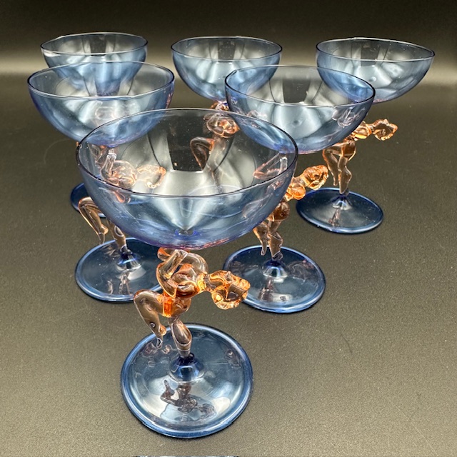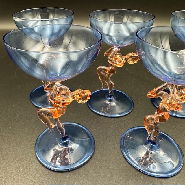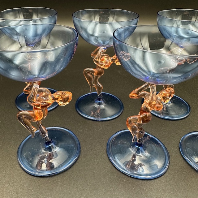 6 Gläser aus den 1900 – 1920er Jahren, handbemalt, tanzende Frauen, aus den Bimini-Werkstätten. Es handelt sich um dünnwandige Kunstgläser, Sammlerobjekte.