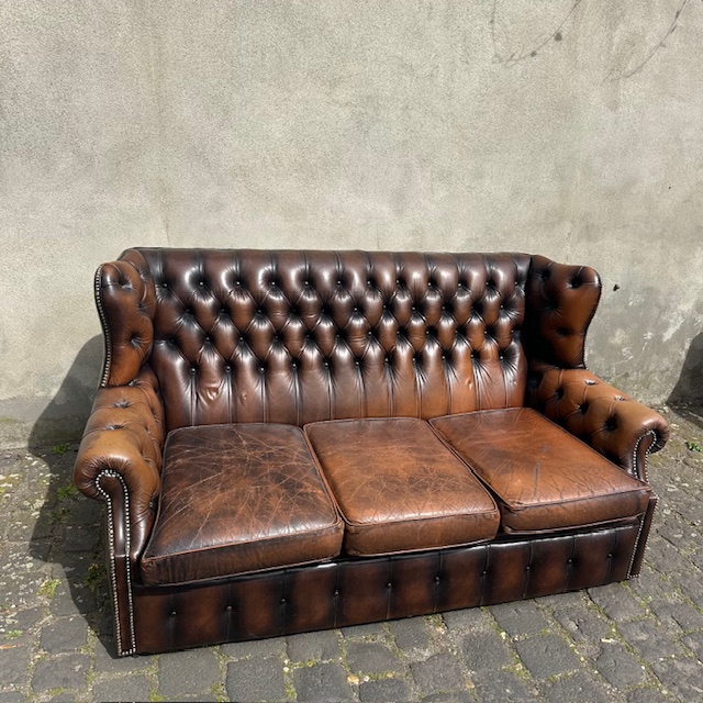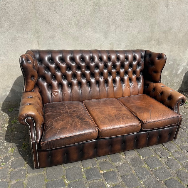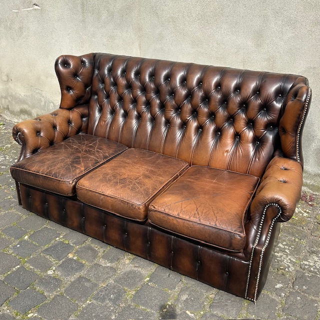 3-Sitzer Chesterfield-Sofa aus braunem Leder, mit hoher Rückenlehne.